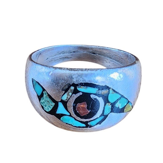 Vintage Native American Ring Sterling Silver Navajo Whirlwind Turquoise Coral Chip Inlay