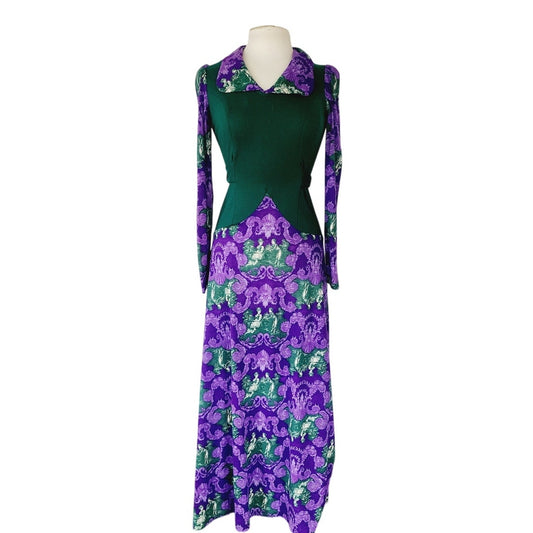 Vintage 70s Maxi Dress Purple French Toile Print & Hunter Green Jody California