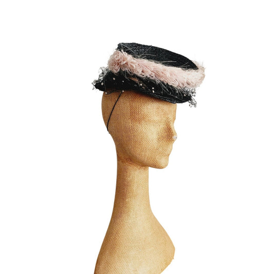 Vintage 1940s Tilt Top Boater Hat Black Straw & Pink Trim