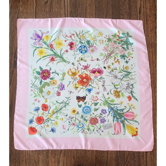 Vintage 60s Gucci Scarf Silk Print Flora Accornero Flowers Butterflies Insects Pink