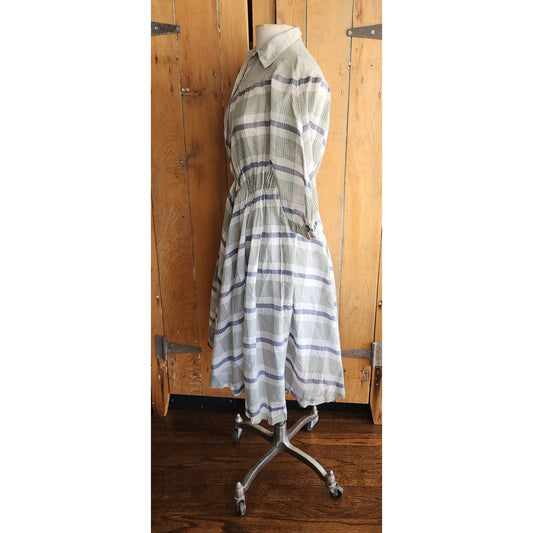 Vintage 50s Gray Dress Chevron Strip Plaid Print / Medium