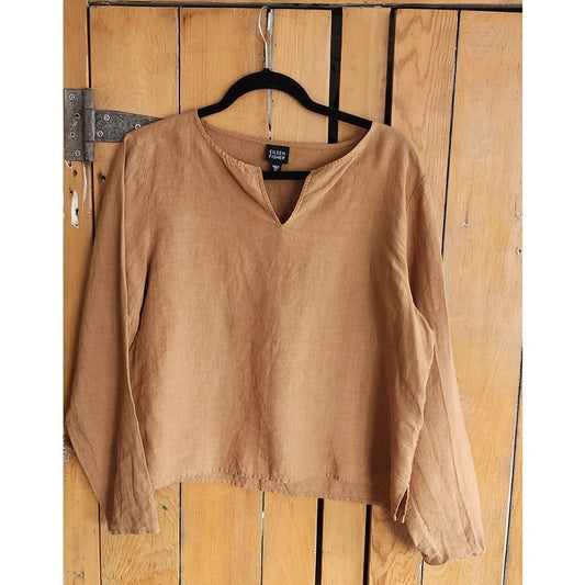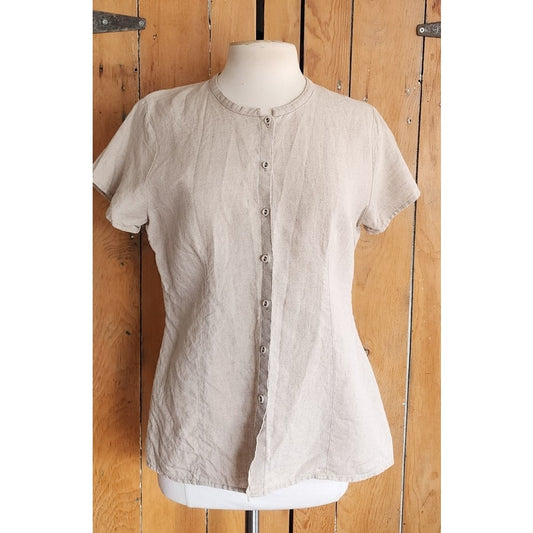 Eileen Fisher Beige Linen Top Short Sleeve Button Down / M