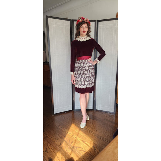 Vintage 70s Red Velvet Dress Cream Lace Skirt Chuck Howard