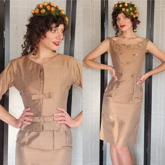 Vintage 50s Beige Silk Dress Suit w/Rhinestones