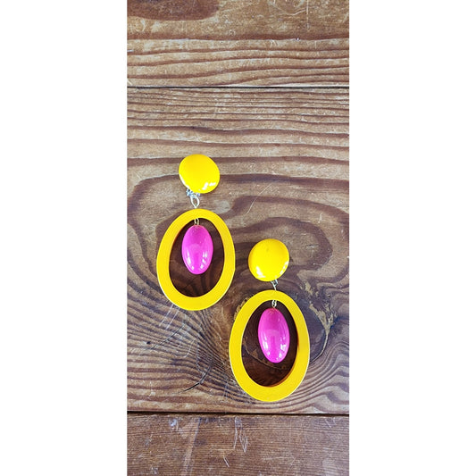 Vintage 60s Earrings Clips Yellow Pink Dangly Hoops Oversized