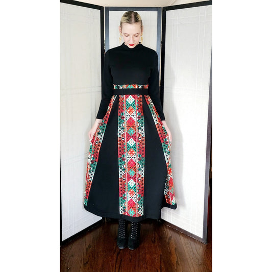 Vintage 70s Black Maxi Dress Colorful Skirt Embroidery Cleopatra Broumand AS IS
