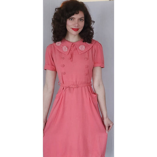 Vintage 40s Coral Pink Dress w/ Embroidered Floral Collar, Belted / M