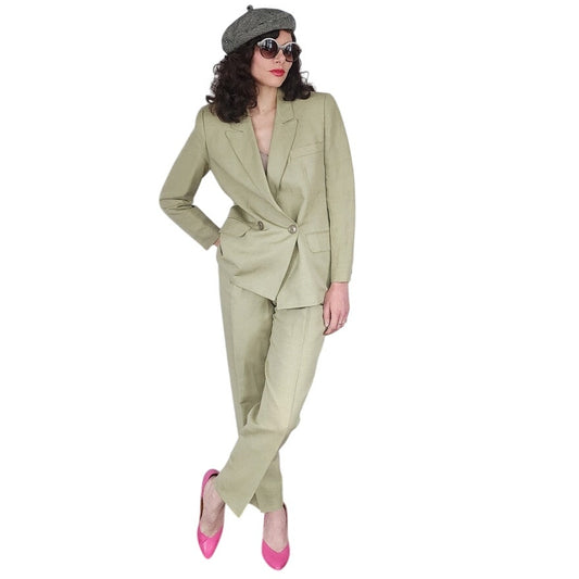 Vintage 80s Designer Pant Suit Pale Green Linen Collectible Gold Giorgio Sant Angelo