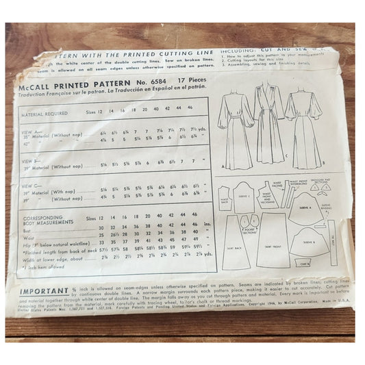 Vintage 40s Sewing Pattern: Ladies Negligee Robe McCall 6584 / Bust 34