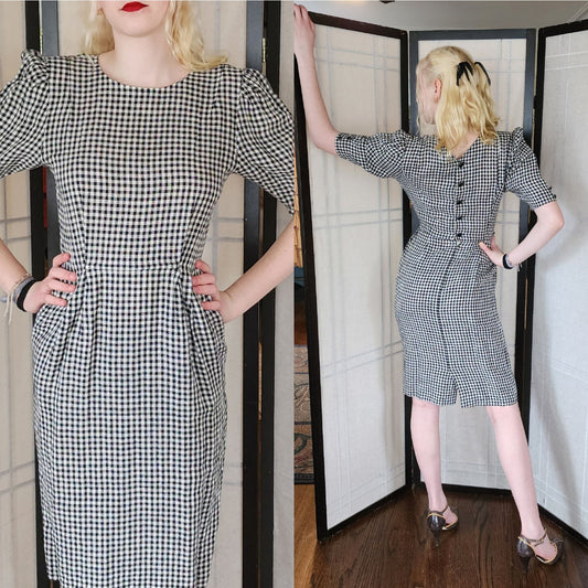 Vintage 80s UNGARO Dress Gingham Print Black White Back Buttons
