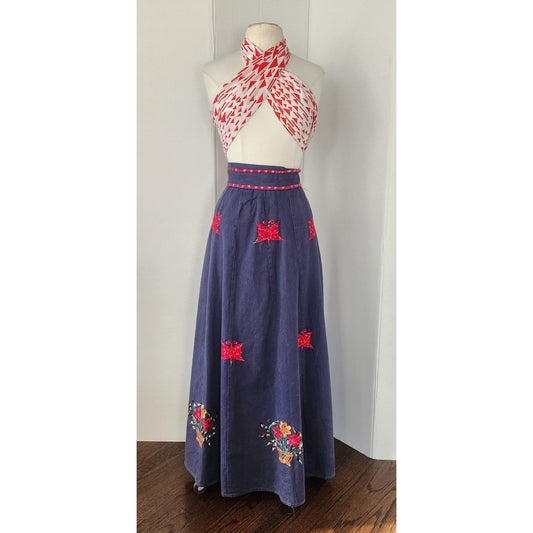 Vintage 70s Maxi Skirt Dark Wash Denim Butterfly Floral Embroidery