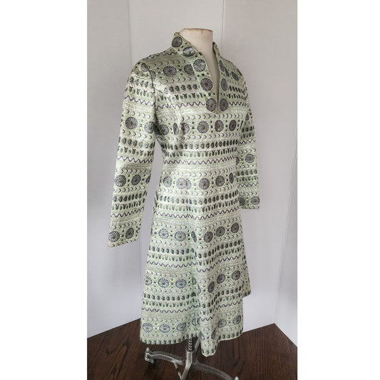 Vintage 60s Brocade Dress Silver Green Metallic Psychedelic Print