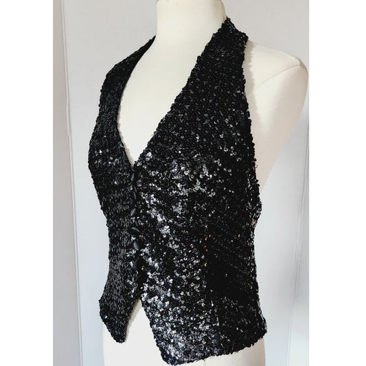 Vintage 70s 80s Halter Top Vest Black Sequins