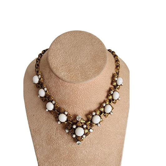 1960s Choker Necklace White Milk Glass & Gold Baroque Style