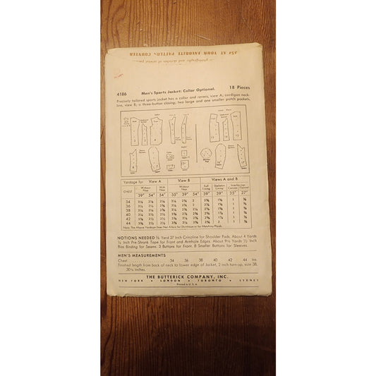 Vintage 40s Sewing Pattern: Mens Sports Jacket Butterick 4186