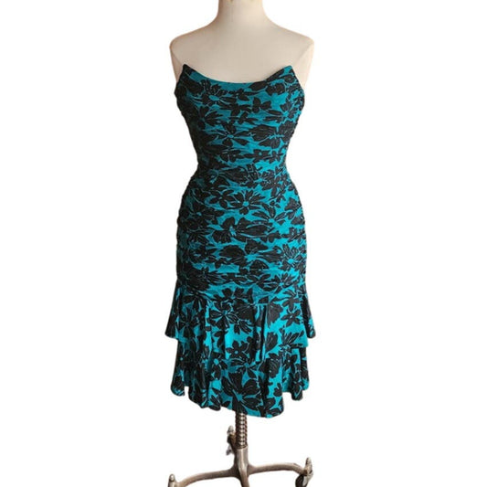 Vintage 80s Strapless Party Dress Teal Black Floral Print