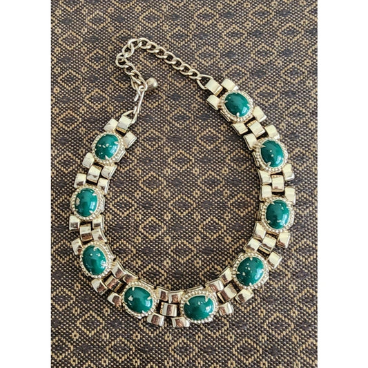 60s Choker Necklace Green Cabochon & Gold Setting