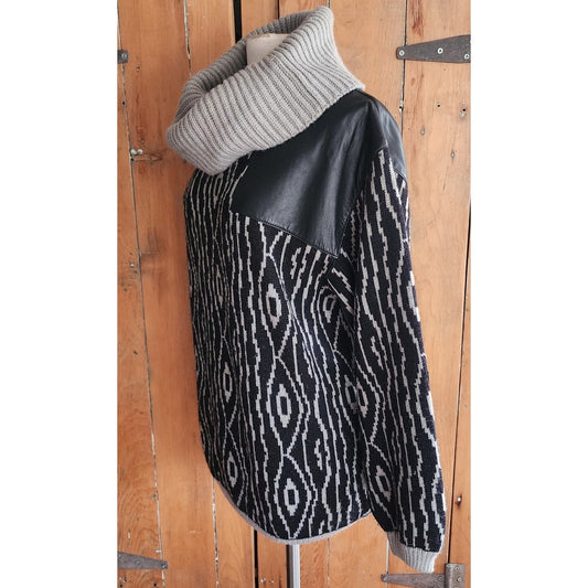 80s Breco's Sweater Black kat Pattern Large Cowlneck Collar Leather Panels