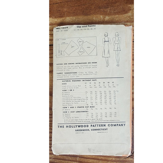 1930s Sewing Pattern: Slip + Pantie Betty Grable Hollywood Pattern of Youth 1839