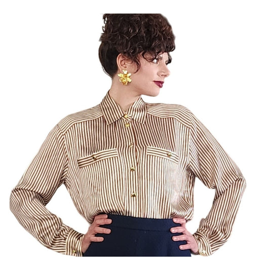 90s Escada Striped Shirt Silk Blouse Brown Cream
