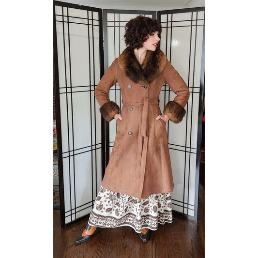 Vintage 70s Brown Suede Afghan Coat Shearling Lined Collar Cuffs Petite