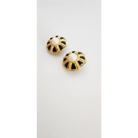 Vintage St John Earrings Clips Gold Pearl Black Enamel Button Style