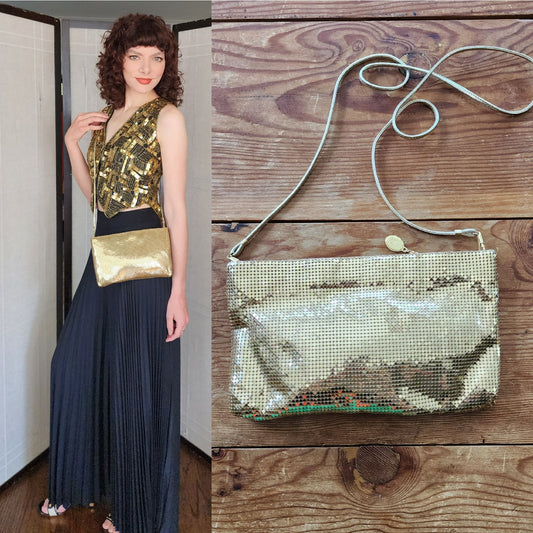 Vintage 70s Evening Bag in Gold Mesh Crossbody Whiting Davis