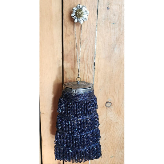 20s Blue Beaded Flapper Bag Fringed Round Mirror Lid Reticule