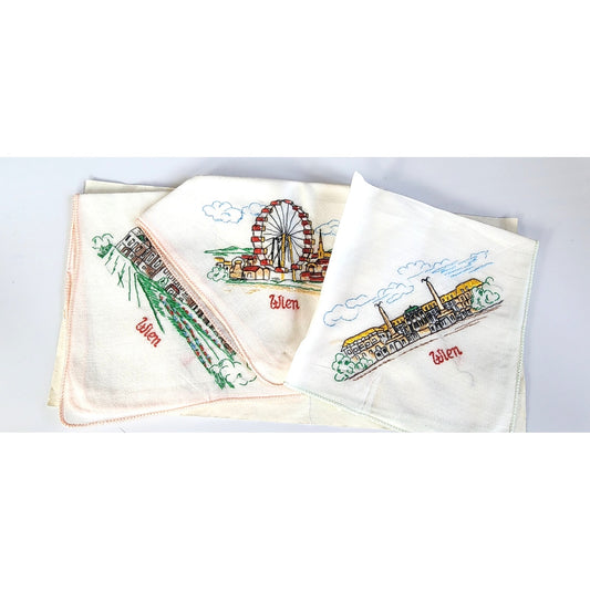 Vintage Embroidered Handkerchiefs Lot of Seven /European City Countries France Oslo Bern Vienna Basel