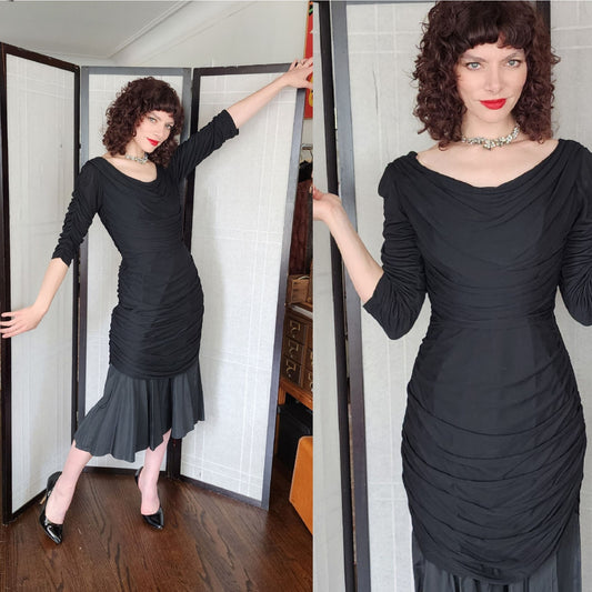 Vintage 50s Fishtail Dress Black Rayon Medium