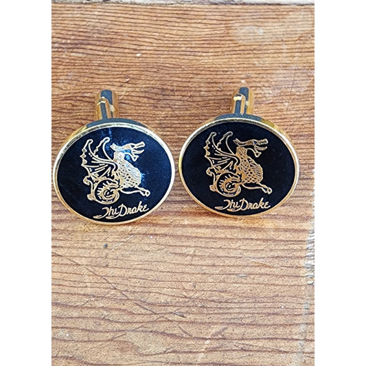 Vintage 50s Cufflinks Black Gold Enamel Dragon The Drake
