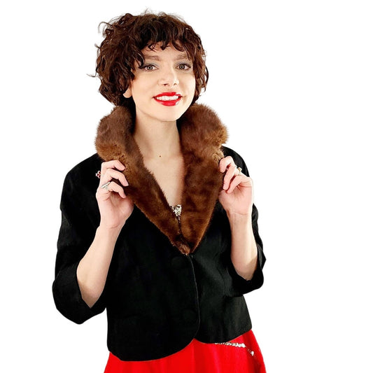 Vintage 50s Black Wool Blazer Brown Mink Fur Collar