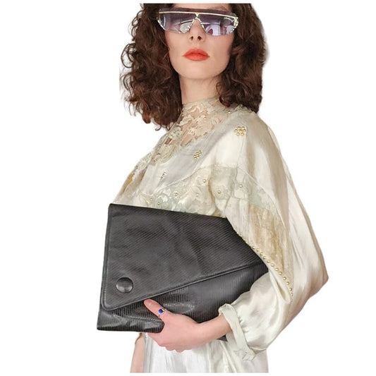 Vintage 80s Large Black Clutch Bag Striped Envelope Purse Cacharel