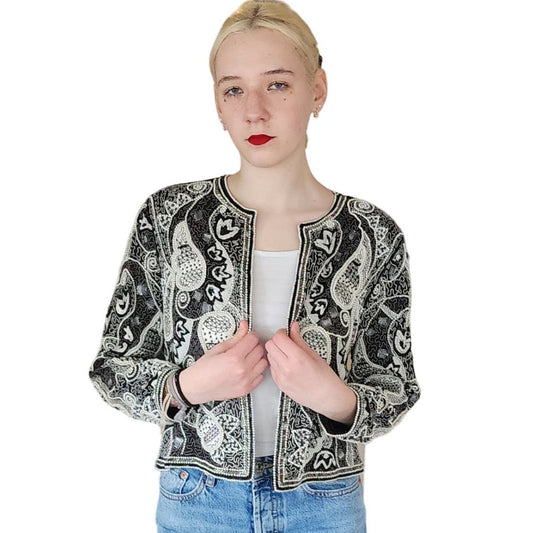 Vintage 80s Beaded Blazer Judith Ann Cropped Jacket Black & White Paisley