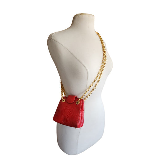 Vintage 90s Judith Leiber Bag Red Lizard Leather Gold Minaudiere
