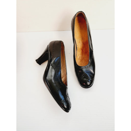 Vintage 30s Shoes Black Leather Pumps Brogueing Letang Chicago Size 6
