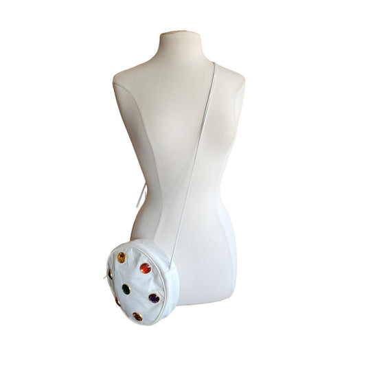 Vintage 80s White Leather Bag Round Purse Colorful Jewels Ohh Ashley