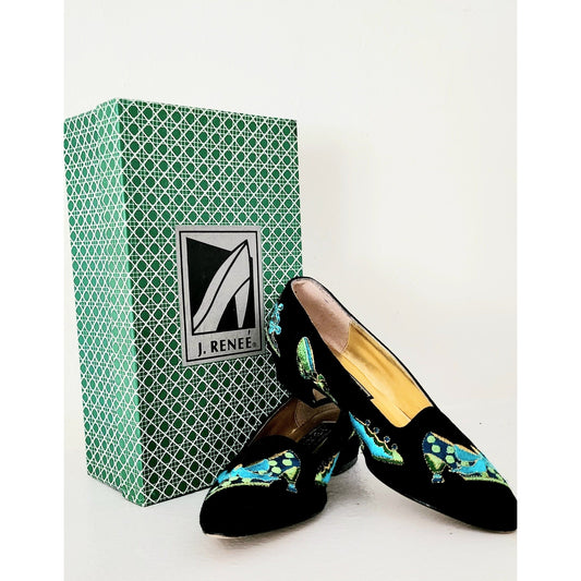 Vintage 90s Black Suede Pumps Green Shoes Embroidery J Renee 7.5