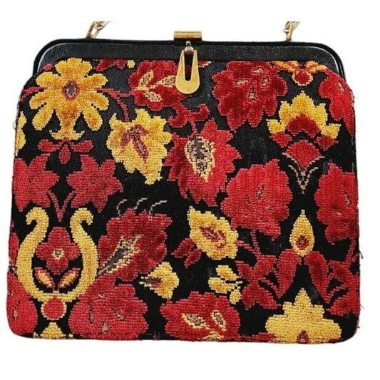 Vintage 60s Tapestry Weave Bag Burgundy Red Yellow Floral Brocade