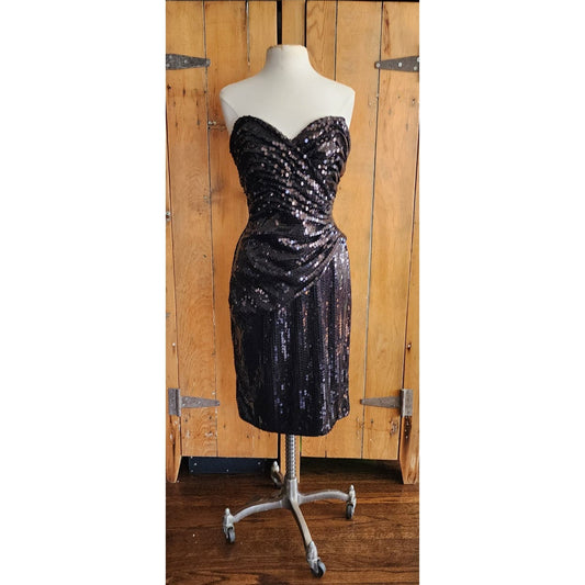 Vintage 80s Tadashi Strapless Dress Black Sequins Ruched Waist