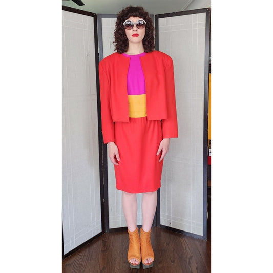 Vintage 80s Colorblock Dress + Jacket Set Orange Yellow Fuschia PS1