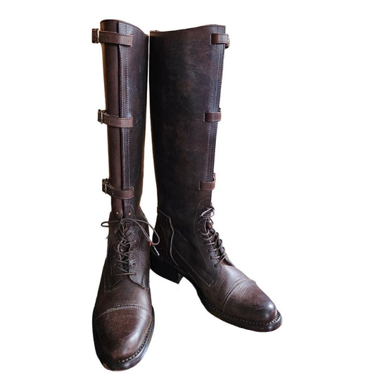 Vintage Brown Leather Knee Boots J Peterman Lace Up + Buckle Closure 6.5