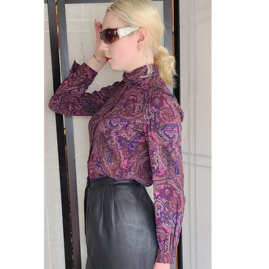 Vintage 80s Ilie Wacs Shirt Purple Paisley Print Blouse I Magnin