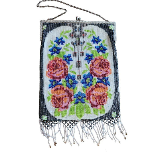 Antique Glass Bead Bag Edwardian Purse Floral Rose Pattern