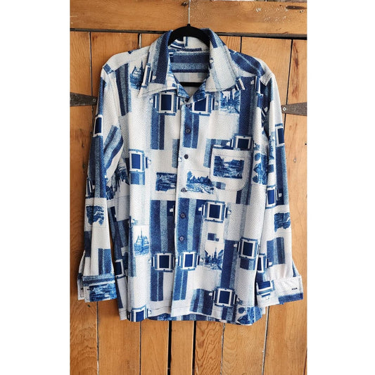 Vintage 70s Novelty Print Mens Shirt Button Down Blue White