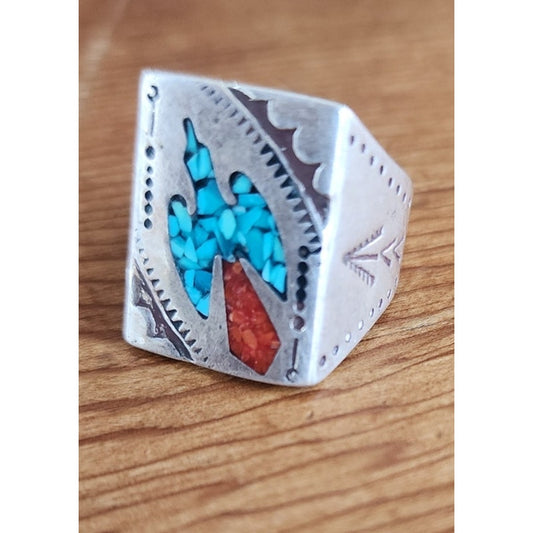Vintage Mens Ring Native American Sterling Silver Thunderbird Turquoise Coral Chip Mosaic Navajo InlayRegular price $190.00 USDRegular priceUnit price per$0.00 USDSale price $190.00 USDSold out