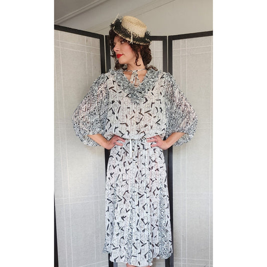 Vintage 1980s Diane Freis Fishtail Skirt Blouse Set Black White Georgette Graphic PrintRegular price $90.00 USDRegular priceUnit price per$0.00 USDSale price $90.00 USDSold out