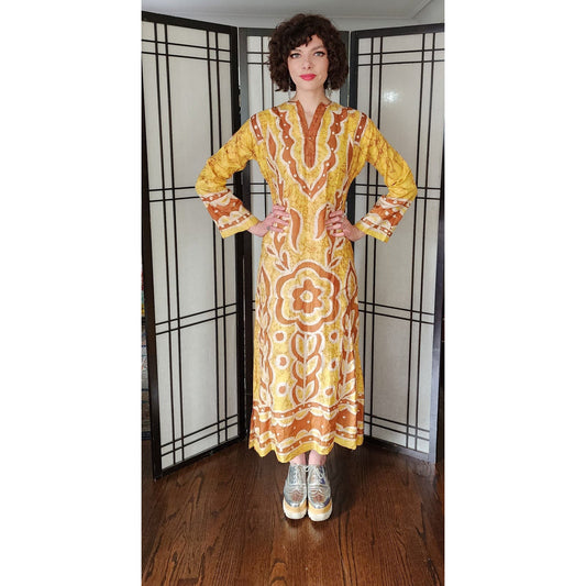 Vintage 60s Caftan Dress in Yellow Brown Psychedelic Print