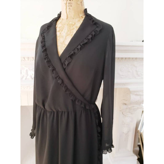 Vintage 70s Black Wrap Dress Ruffled Shawl Collar Long Sleeves