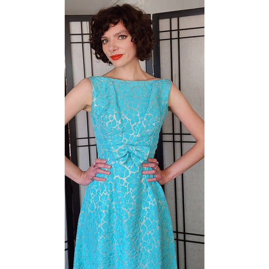 60s Party Dress Blue Gold Maxi Pebble Texture Sleeveless w/Bow / S